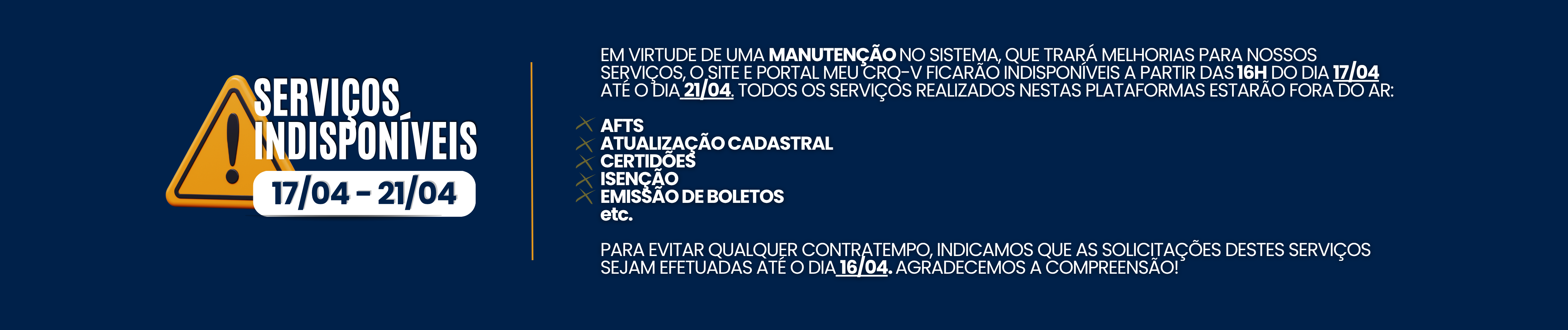 Em virtude de uma manutenção no sistema, que trará melhorias para nossos serviços, o SITE e PORTAL MEU CRQ-V ficarão indisponíveis entre às 16h do dia 17/04 até o dia 21/04.